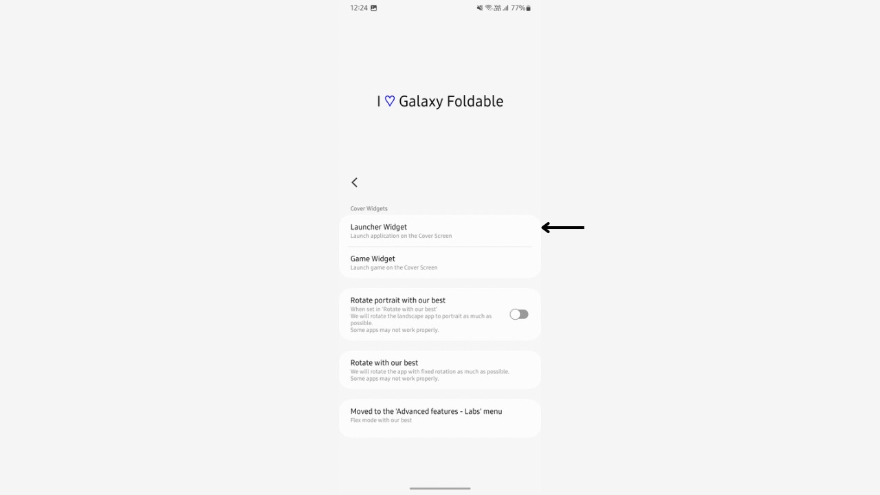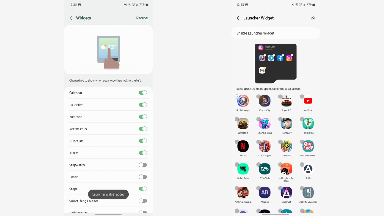 This is where the magic starts to happen. Here in this menu, you can choose what apps you want to run on the cover screen, including games. Click on ‘Launcher Widget’ and then on ‘Enable Launcher Widget’.