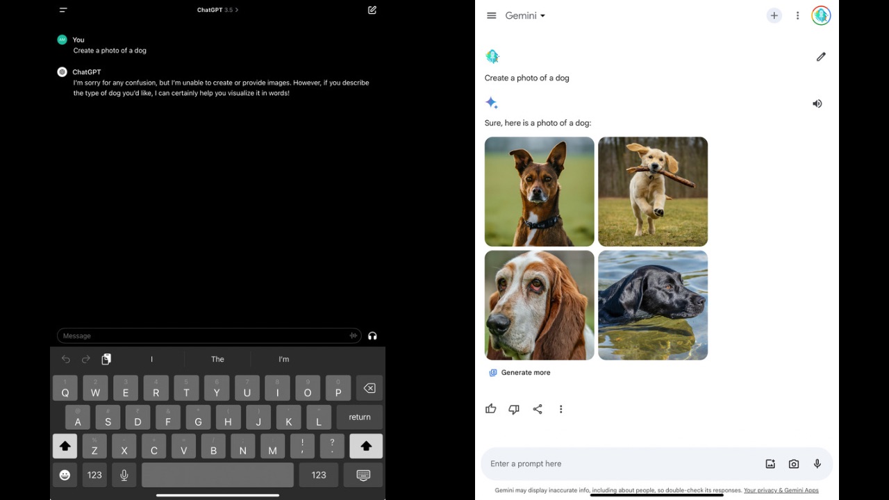 However, because Gemini is made by Google, it is well integrated within the Android operating system compared to ChatGPT. Gemini is more easily accessible on Android, such as by swiping through the corner of the screen or tapping and holding the home button or the power button, which is something ChatGPT cannot do on Android as it can only be used via its app. Due to Google’s proprietary OS advantage, Gemini takes the winner status for how easily accessible the chatbot is on Android.