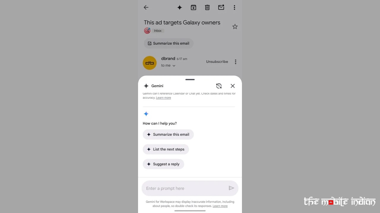 If you open a mail, the Gemini button resides in the action bar at the top, next to the Archive button. If you tap on it while the email is opened, you can ask Gemini to summarise the content of the email, list the next steps, suggest a reply for the mail, or do more.