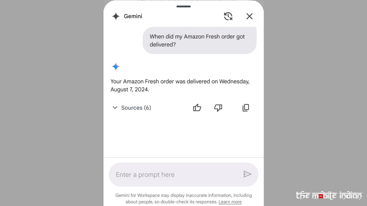 You can ask Gemini for your latest order updates, show unread emails, and more. In addition, the results show you the sources (basically the Emails) from where Gemini procured the information. If you want, you can also easily clear the Gemini history with the tap of a button (the one next to the cross).