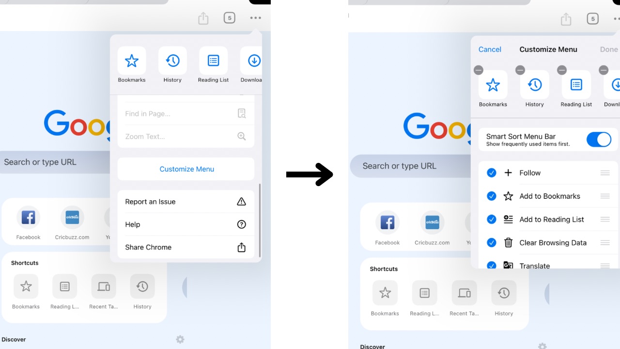Spotted by 9to5Google, the new update for Google Chrome on iPad and iPhone allows you to customise the menu bar via a new “Customise Menu” button that can be found when you scroll down to the bottom in the said menu. For those unaware, the menu bar is the same menu that appears when you tap on the three-dot overflow button at the right corner.