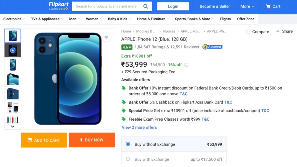 Furthermore, if you trade in your older smartphone, then you can avail an extra discount of up to Rs 17,500, which brings down the total price of iPhone 12 128GB variant on Flipkart to Rs 36,499. Note that the trade-in value of your older smartphone is calculated based on the phone’s physical and internal condition.