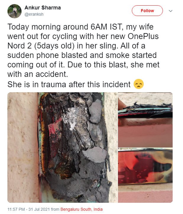The first incident was reported on August 1 by a Bengaluru-based user named Ankur Sharma. The person on Twitter alleged that wife’s OnePlus Nord 2 blasted inside her sling bag while she was cycling. The woman bought the new Nord 2 just a few days ago.