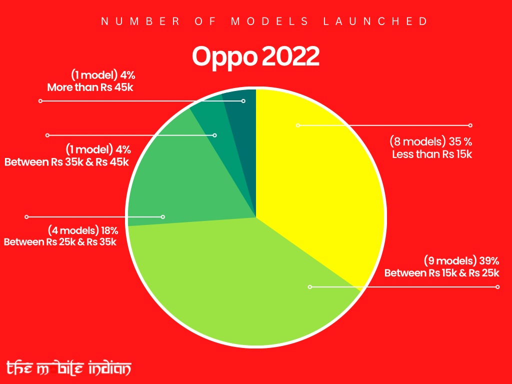 During this past year, Oppo launched a total of 19 smartphones spread across 23 variants of these devices. Last year, the brand launched just 14 models and 19 variants of these models. Out of the 23 variants launched in 2022, 8 devices were priced under Rs 15,000, 9 were priced between Rs 15,000 and Rs 25,000, 4 were there in the Rs 25,000 to Rs 35,000 range, 1 was present in the Rs 35,000 to Rs 45,000 range while 1 remaining smartphone was priced between Rs 45,000 and Rs 55,000.