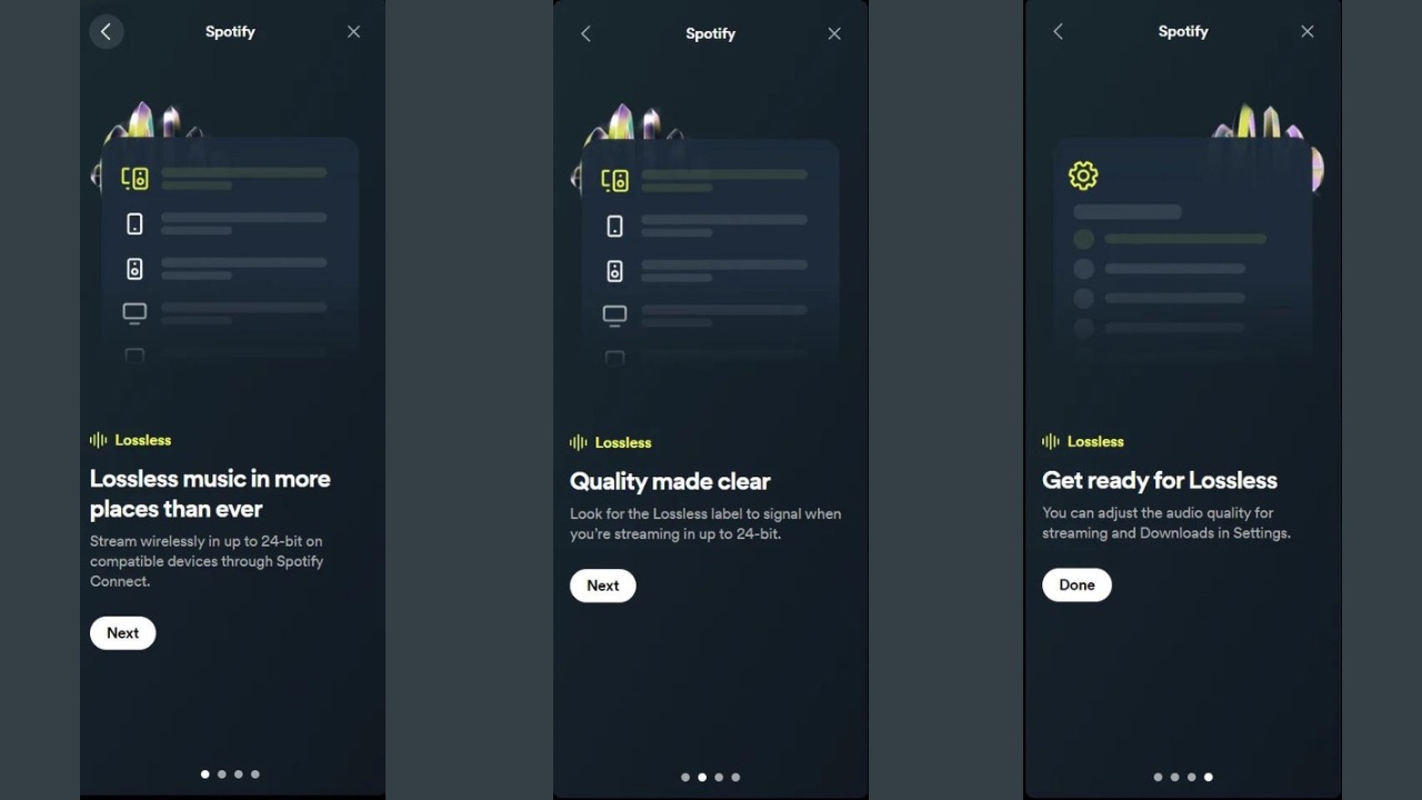 The leaked screenshots from the mobile app hint that the feature introduction prompts will tell users that they can stream wirelessly in “up to 24-bit” on compatible devices through Spotify Connect. In addition, a “Lossless” label will be shown to indicate that lossless streaming is in progress.