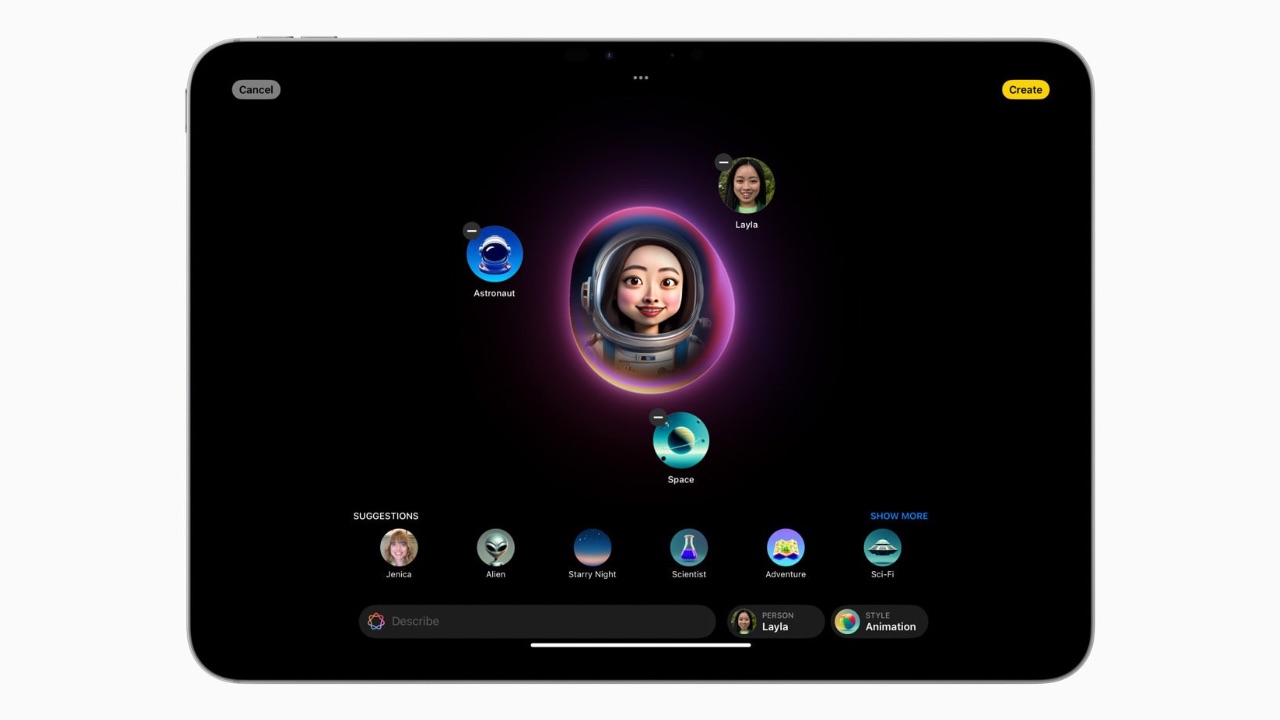 Next up, Apple Intelligence also powers Image Generation features, such as Image Playground, where users can create fun images in seconds, choosing from three styles: Animation, Illustration, or Sketch. Image Playground is built right into apps including Messages. It’s also available in a dedicated app, so users can try out different concepts and styles. All images are created on device, says Apple.