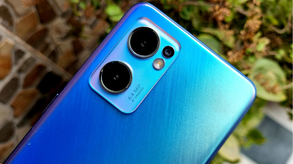 The Reno 7 has a triple camera setup at the back which includes a 64MP primary sensor, an 8MP ultra-wide unit, and a 2MP macro snapper. On the front, it nests a 32MP selfie shooter inside the punch-hole at the top left corner.