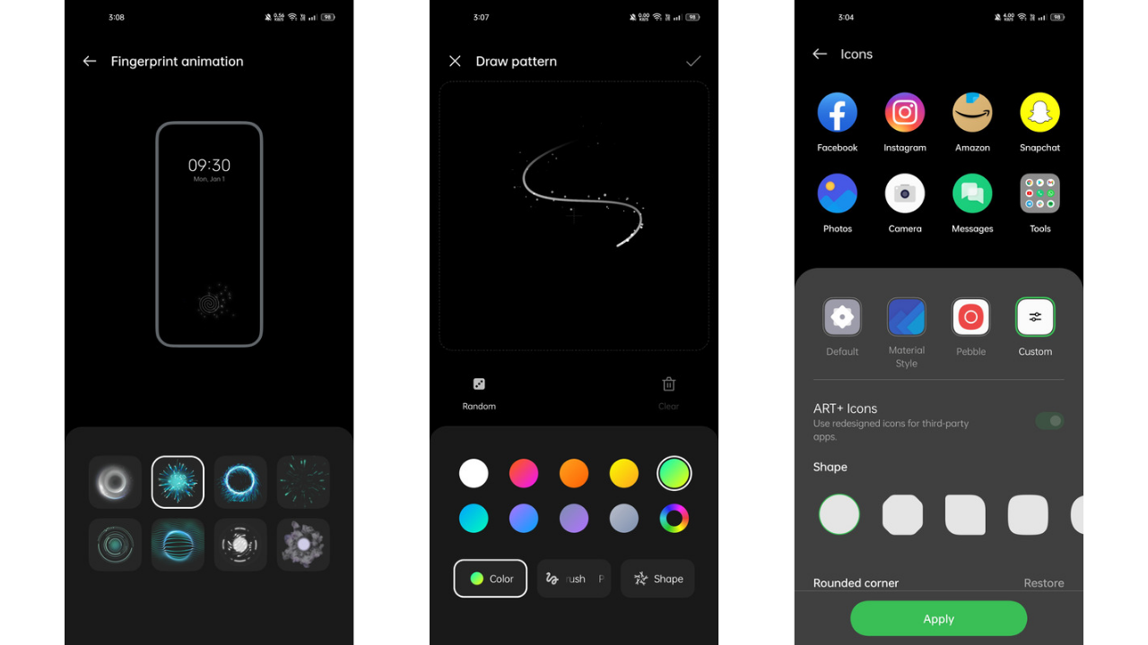 Next in line under personalization settings is the Always-On display. For this, there are so many options to choose from that you may get confused as to which one you should pick. GIFs, custom photos, patterns, text, etc can be used to apply to the Always-On display. One can also choose from 8 different styles of fingerprint animations and different colours for EDGE lighting. There’s a dedicated theme store with both free and paid themes and fonts to choose from.