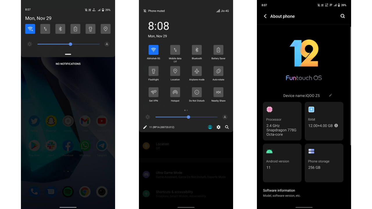 Talking about software, the device comes with FunTouch OS 12 out of the box which is based on Android 11. It gets power from the Snapdragon 778G SoC with up to 12GB of RAM and 256GB of storage. We got the 12GB + 256GB variant that handled everything very well during the review period of iQOO Z5.
