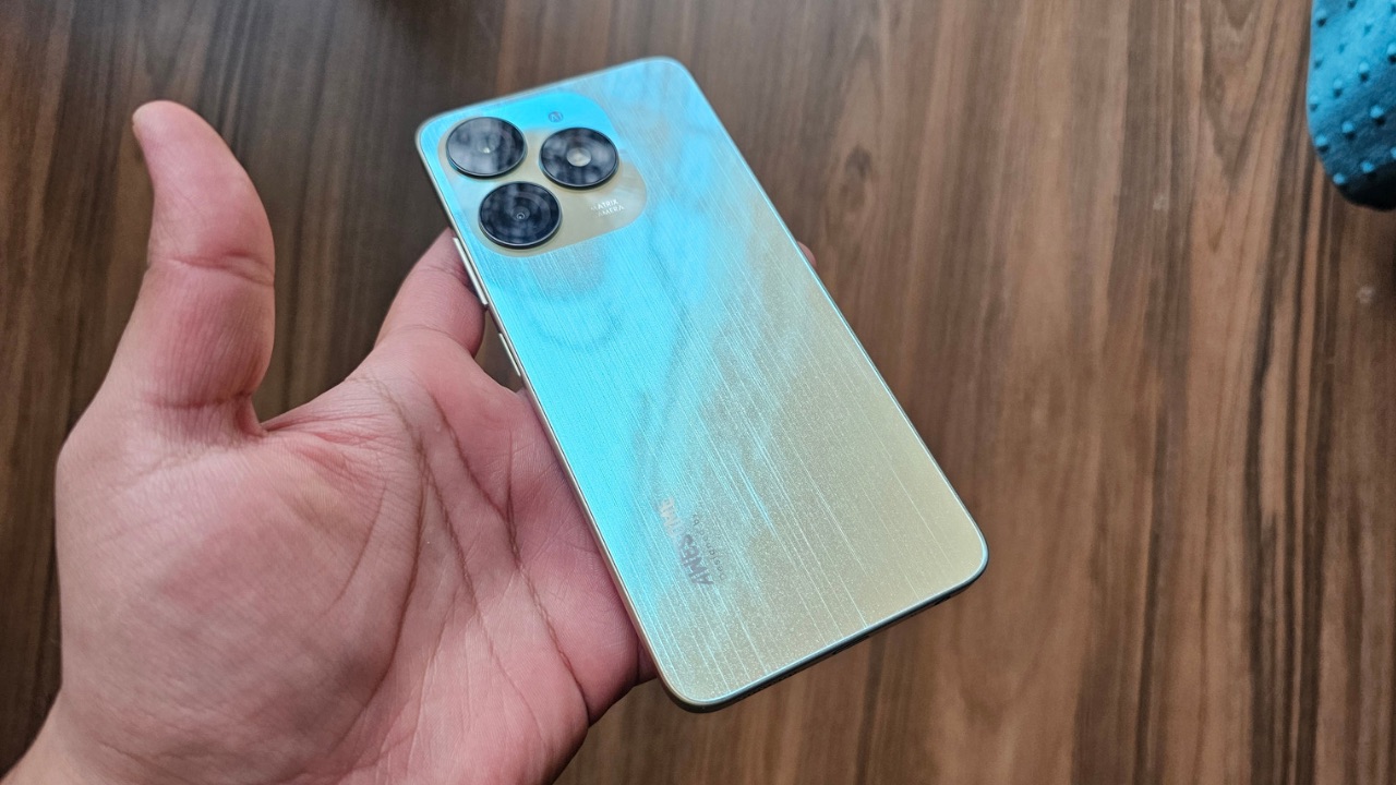 Then, the Itel A70 feels lightweight with an appealing design. The golden version we got has the blue shade incorporated as well, where the lined pattern appears in that colour. The rear design language also resembles that of the Infinix Smart 8, Smart 8 HD, and the Tecno Spark Go 2024. Itel is also offering a black silicone case inside the box which is a decent touch. Overall, it’s an attractive looking handset.