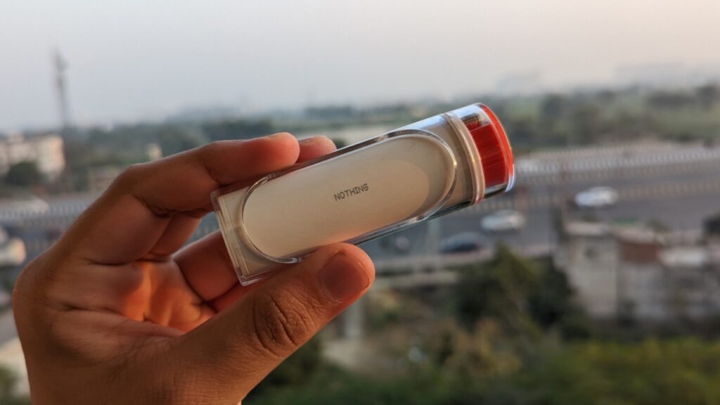 The case can be twisted either clockwise or counter clockwise to open it. When it is closed, the Nothing branding on the opposite side is exposed to the touch. The case seems like a strong one and can withstand falls.