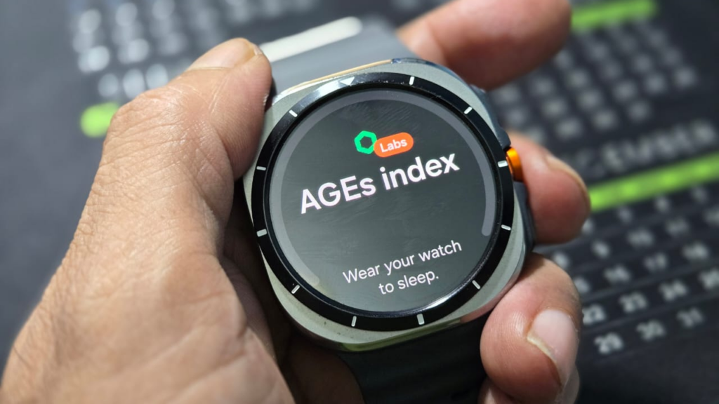 To measure body composition, users place their middle and ring fingers on the home and back buttons. The BioActive sensor sends electrical signals through the body and returns data on fat, muscle mass, and BMI. While this method is not 100% precise, it provides useful trends for tracking over time. The Galaxy Watch Ultra also introduces a new feature for monitoring Advanced Glycation End Products (AGEs), which are linked to biological ageing and metabolic health.