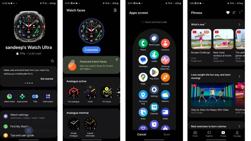 The touchscreen also plays a key role in navigation. Swiping down opens a customizable Quick Panel while swiping left and right provides access to tiles for fitness stats, calendars, and more.