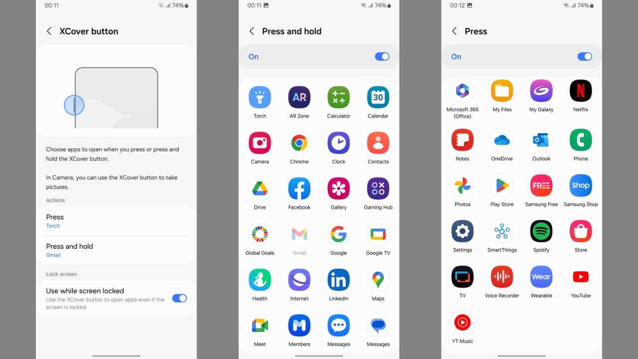 The device has an extra button called the “XCover button” on the left. It is almost the same length as the volume button but bigger, has a dotted texture on it, and has an orange lining around it. This button is remappable to whatever you want it to do, like holding it to open an App or pressing and holding to toggle the flashlight.