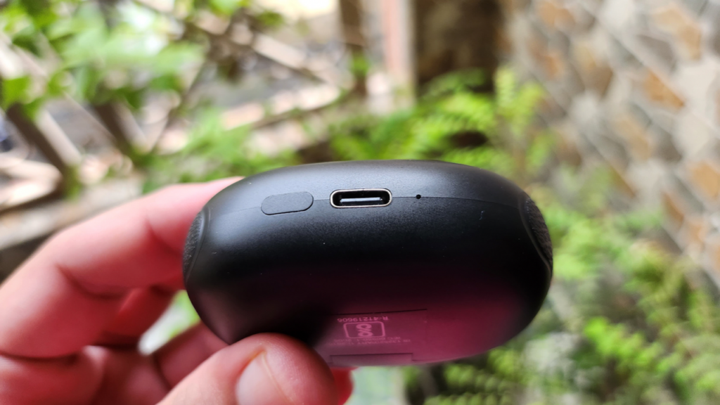 Now, the LED indicator definitely looks cool with plastic-based leather patches on the right and left sides of the case. The plastic case doesn’t feel very premium in quality mainly because of the flimsiness. Because of this, the LED charging indicator automatically turns on if the case moves even a little bit as the buds inside it also move. While the percentage of the case doesn’t go down, the LED can be a bit distracting at times. At the bottom, there’s a USB-C port for charging and a button to reset the pairing status of the buds.