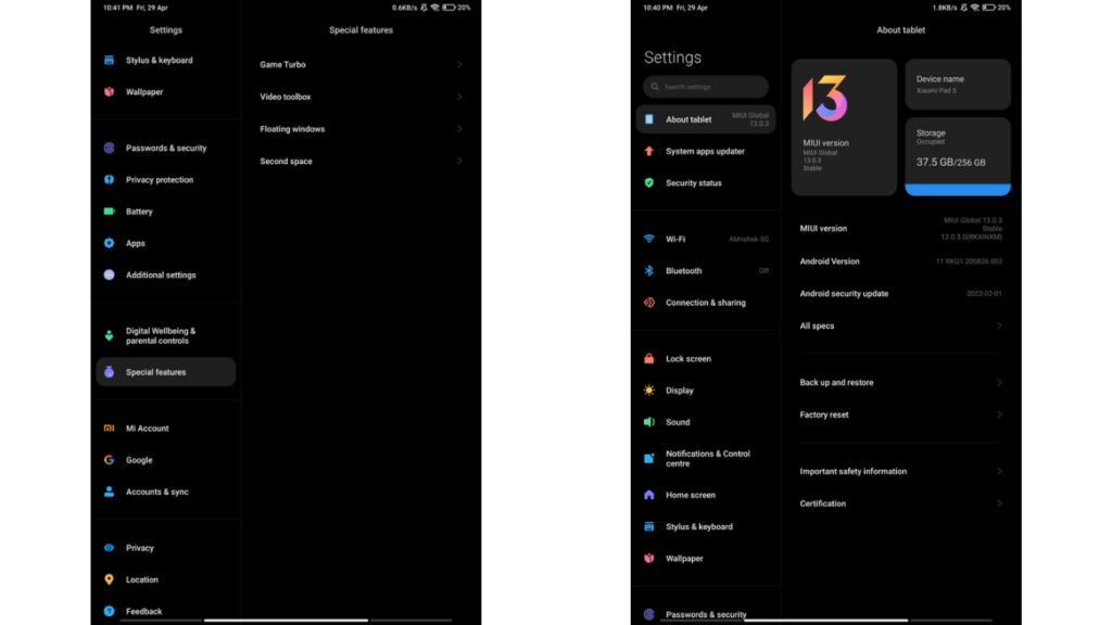 6GB of LPDDR4x RAM is standard on the Xiaomi Pad 5. However, I would have liked it if it was 8GB because MIUI 13 for Pad seems like a resource-heavy UI. It couldn’t keep all of my apps in memory and I often had some apps load out on me. Yes, they opened back up in a second, but it does bother when you want the App to stay and resume from where you left it off.